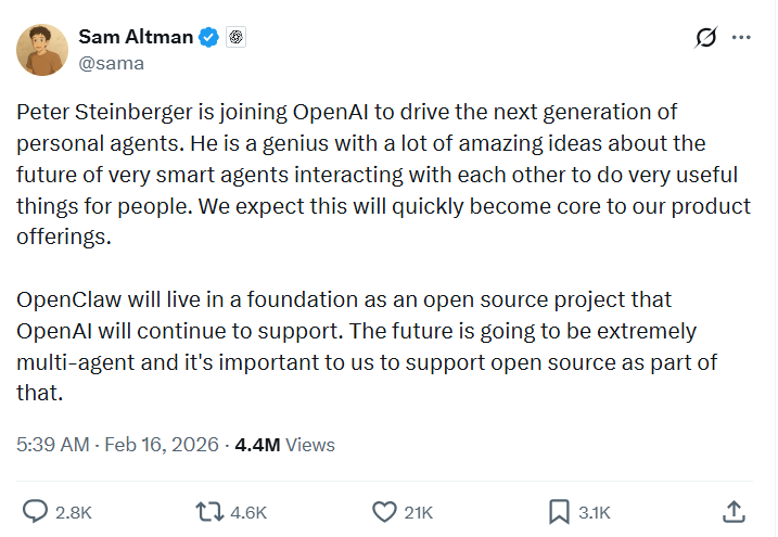 Steinberger坦言:“最终,我觉得OpenAI是继续推动我的愿景并扩大其影响力的最佳场所。”